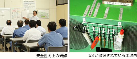 製造・生産現場での安全確保に向けて、生産拠点内に勤務する全てのスタッフに対して定期的な安全教育・研修会の開催、スタッフ同士の相互安全確認及び安全パトロールの実施、製造・生産現場内での5Sの徹底などを行っています。